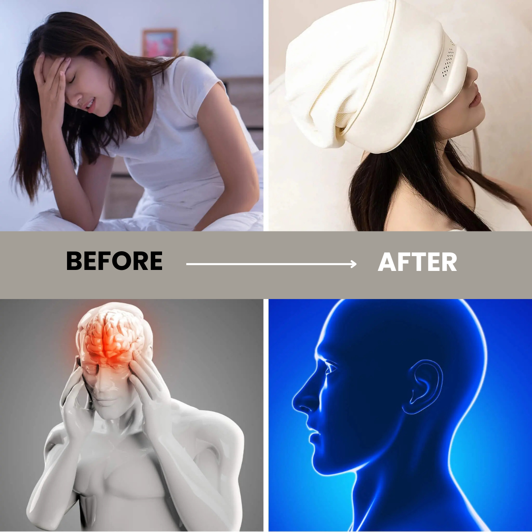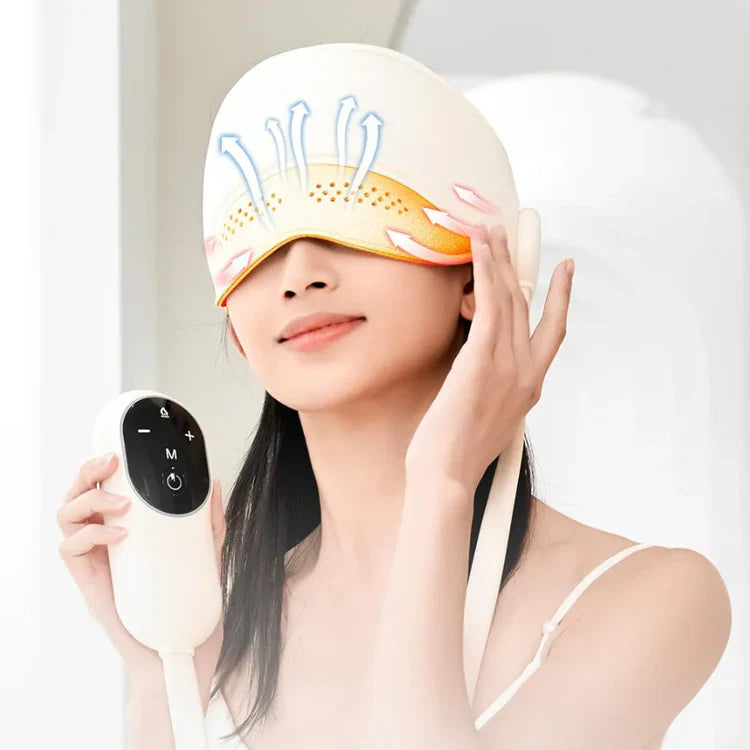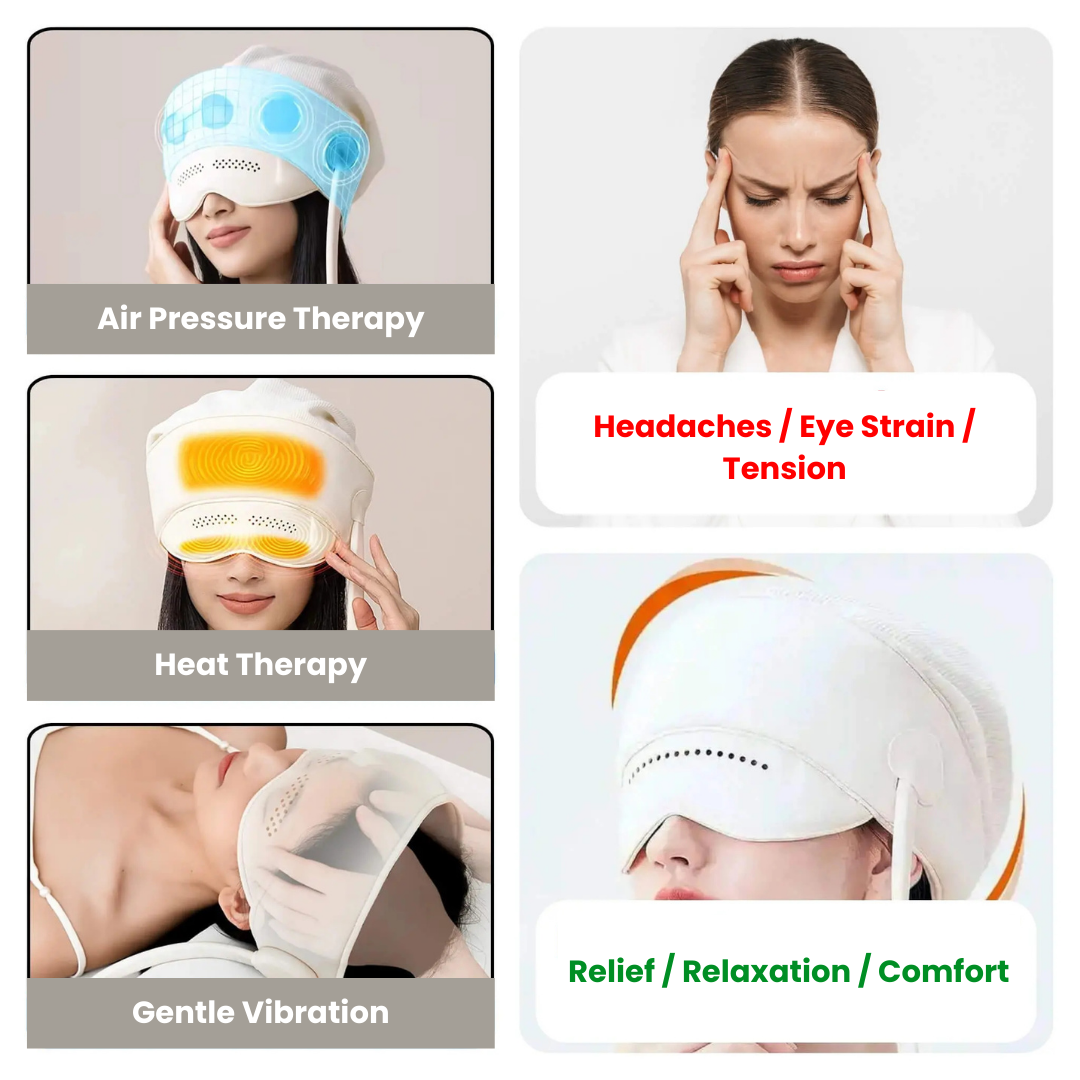 AuraEase™ combines air pressure, heat therapy, and gentle vibrations to relieve headaches, reduce eye strain, and promote relaxation. It delivers gentle compression, soothing warmth, and calming vibrations to target tension and improve circulation.